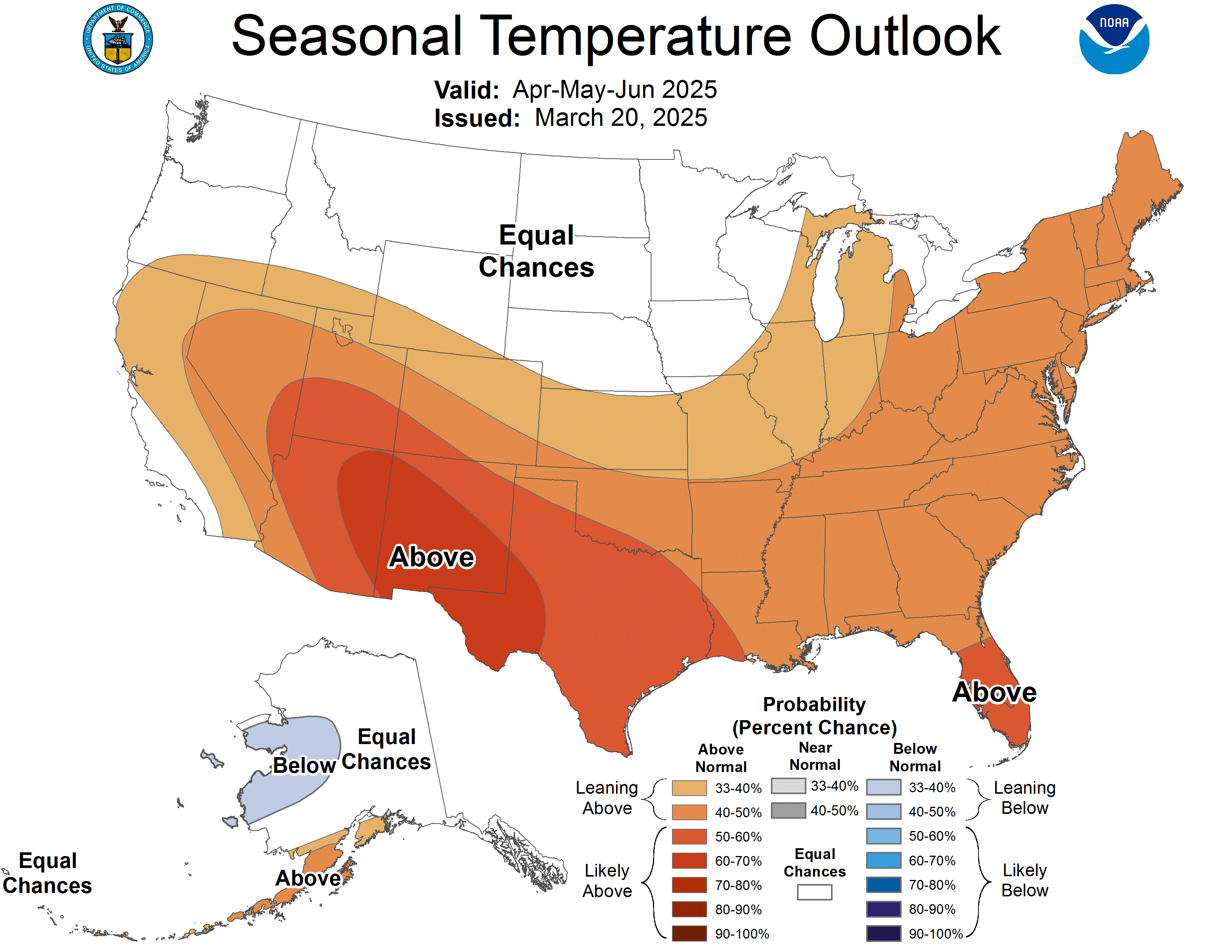 Above-average temperatures are favored for much of the southern and eastern half of the U.S. For April through June, the greatest chance for above-average temperatures exists from the southern High Plains eastward to Florida, and northward along the East Coast. Above-average temperatures are also likely for Hawaii and northern parts of Alaska. Below-average temperatures are predicted for the central Great Basin and the northern Plains.