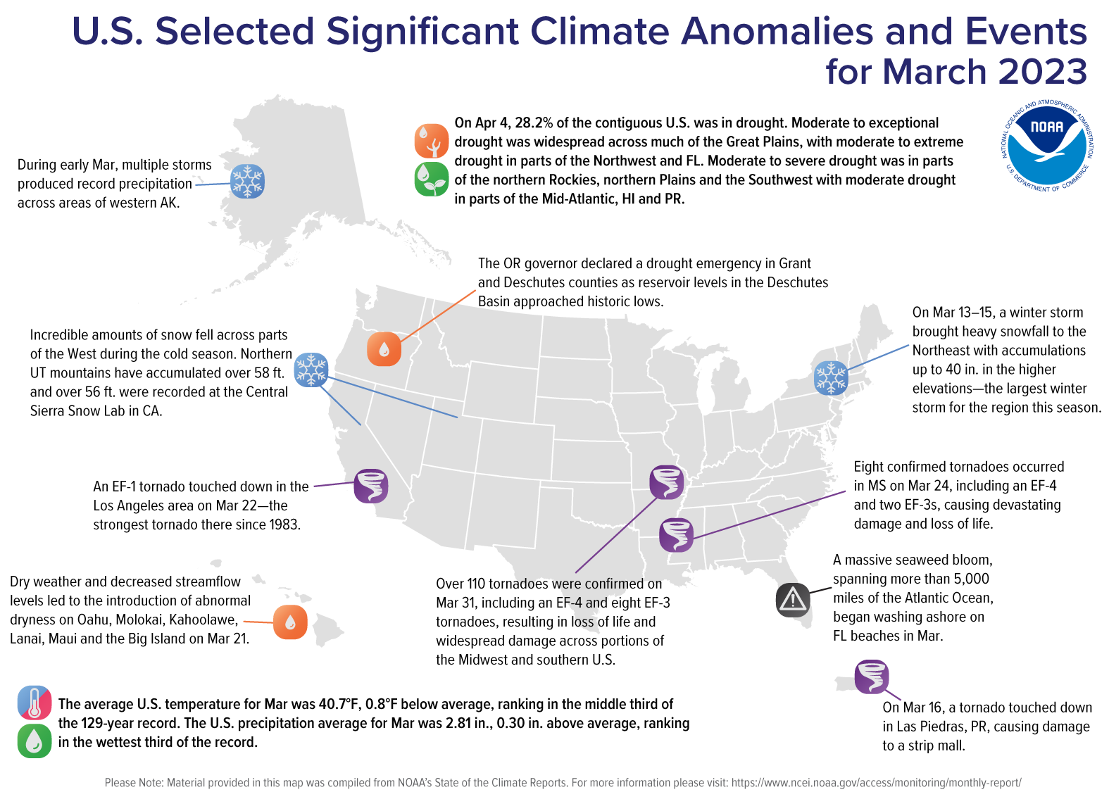 - March 31: A widespread and deadly tornado outbreak ravaged portions of the Midwest and southern U.S. NOAA confirmed more than 110 tornadoes — the largest outbreak in a 24-hour period for the month of March.