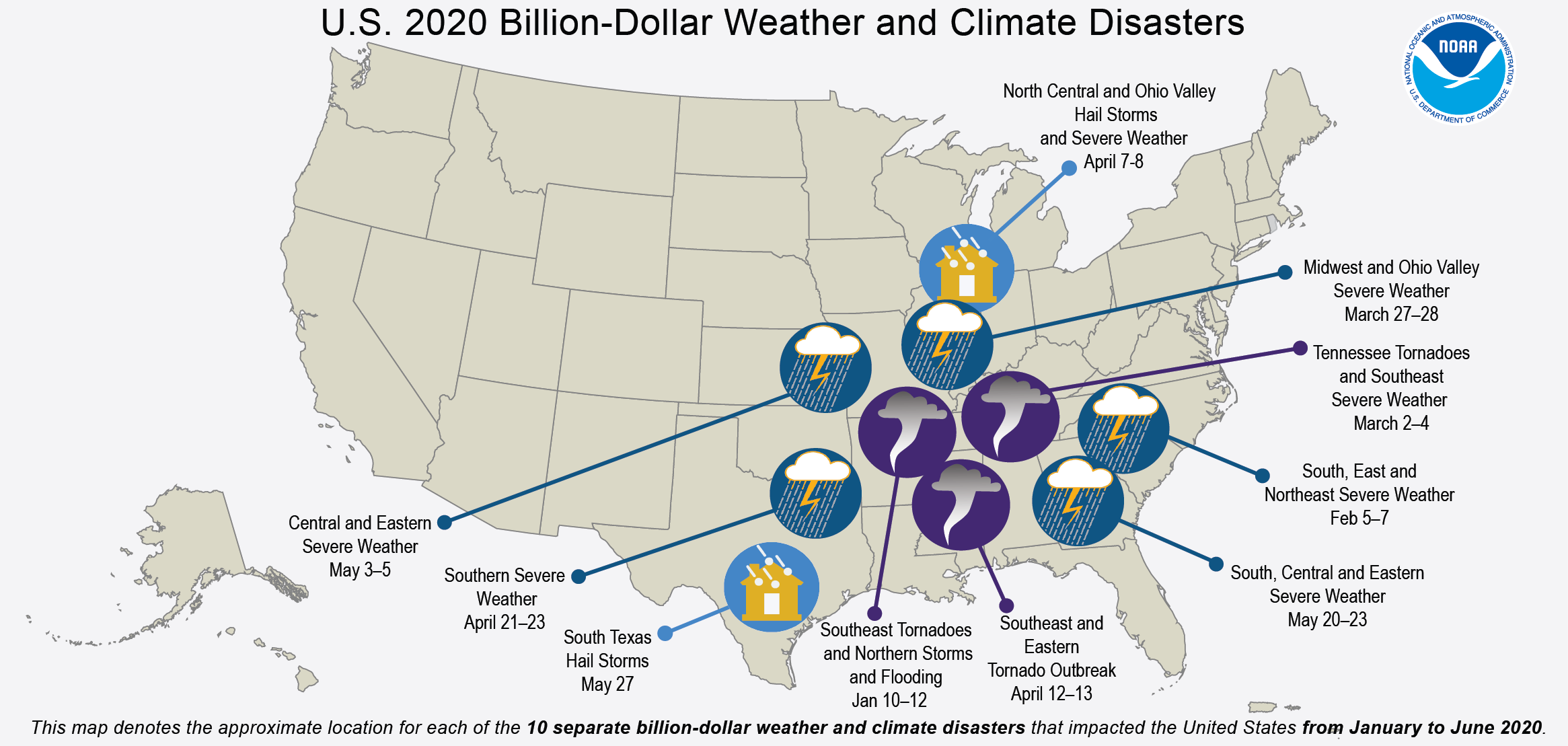A map of the United States plotted with 10 billion-dollar weather and climate disasters that occurred from January through June, 30, 2020. The events were largely related to severe weather. Download this map image and read the summary at www.ncei.noaa.gov/billions.