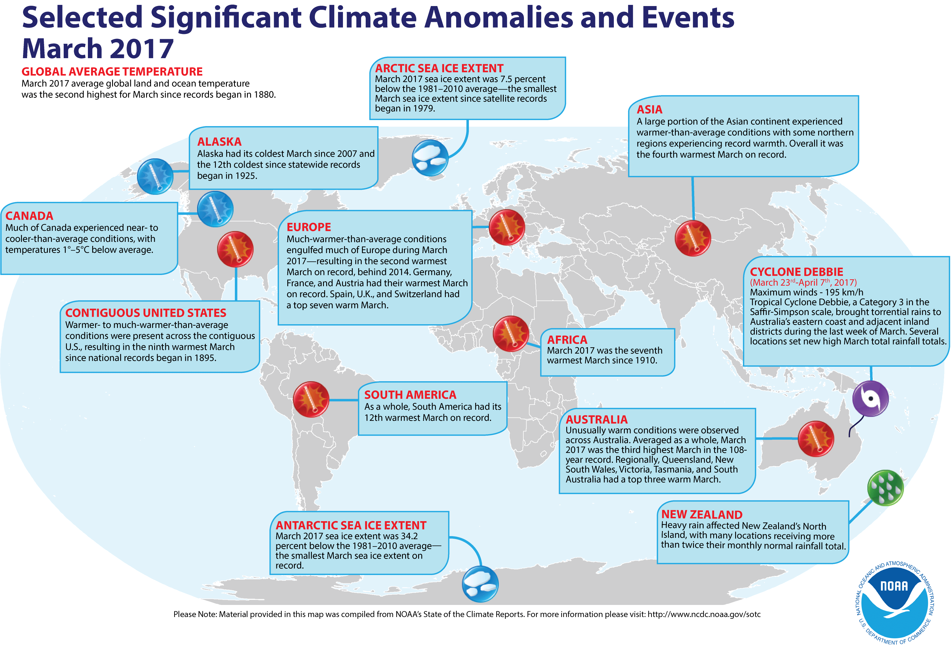 A collage of typical climate and weather-related events: heatwaves, drought, hurricanes, wildfires and changes in sea ice coverage. (Image credit: NOAA)