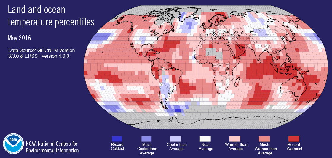 May 2016 broke last year’s record for the warmest May on record for the globe by 0.04 degrees F, according to scientists from NOAA’s National Centers for Environmental Information.