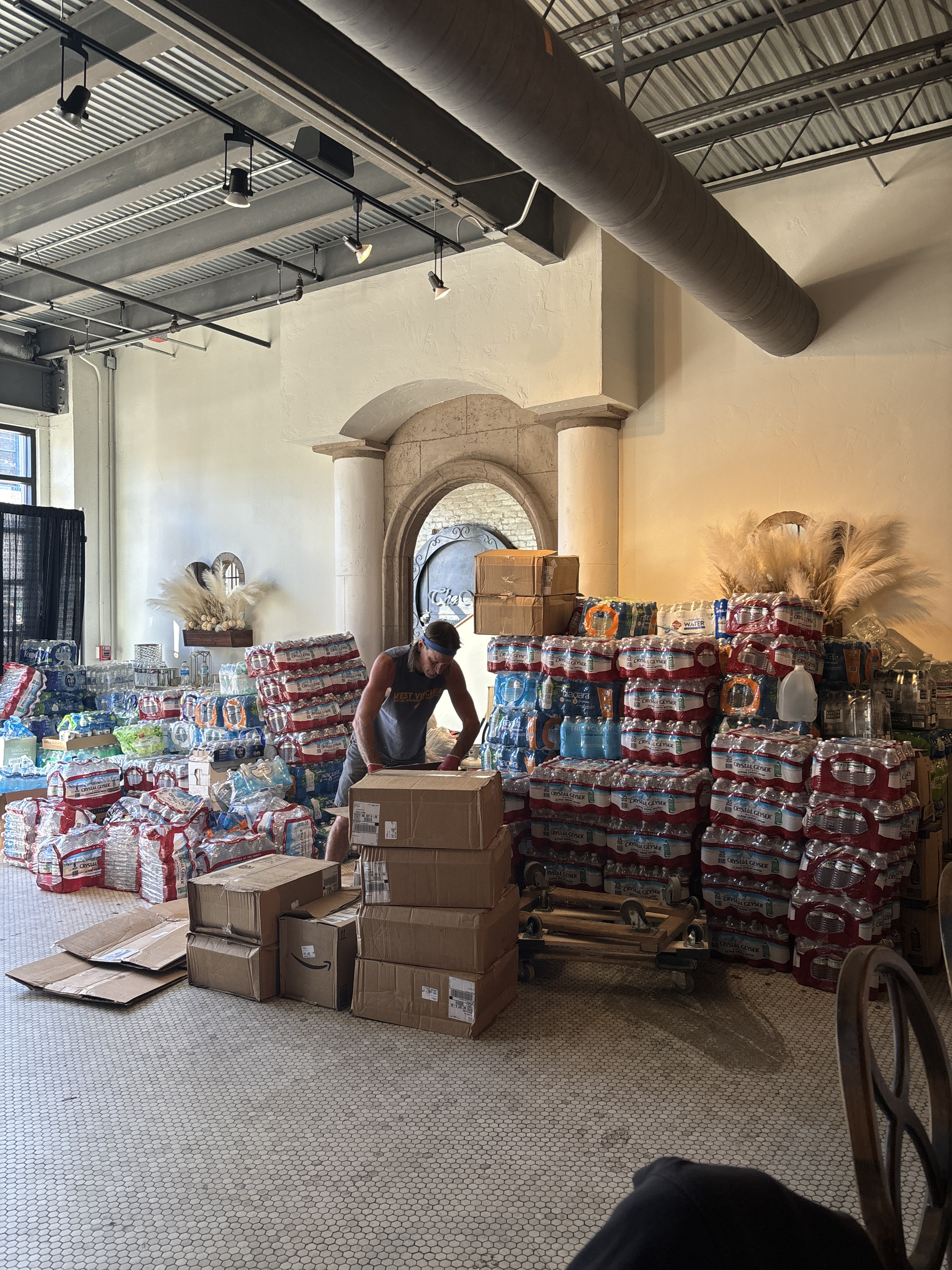 A volunteer is organizing supplies to distribute. After Hurricane Helene, Asheville, NC residents gathered supplies for those in need. A colleague of the Industry Proving Grounds initiative, who volunteered to help coordinate supplies and distribution sites like this one, took this photo. (Image credit: Allison Bashford, IPG UE Retail)