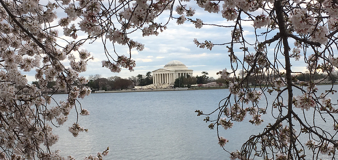 A warmer-than-normal winter in the Mid-Atlantic brought Washington, D.C.'s famed cherry blossoms to the brink of full bloom by mid-March, but then a cold snap hit and froze at least half the blossoms. The remaining Japanese Yoshino cherry blossoms reached peak on March 25, 2017. Pictured here is the Jefferson Memorial across the Tidal Basin, Washington, D.C., March 28, 2017. (Image credit: Brady Phillips/NOAA)