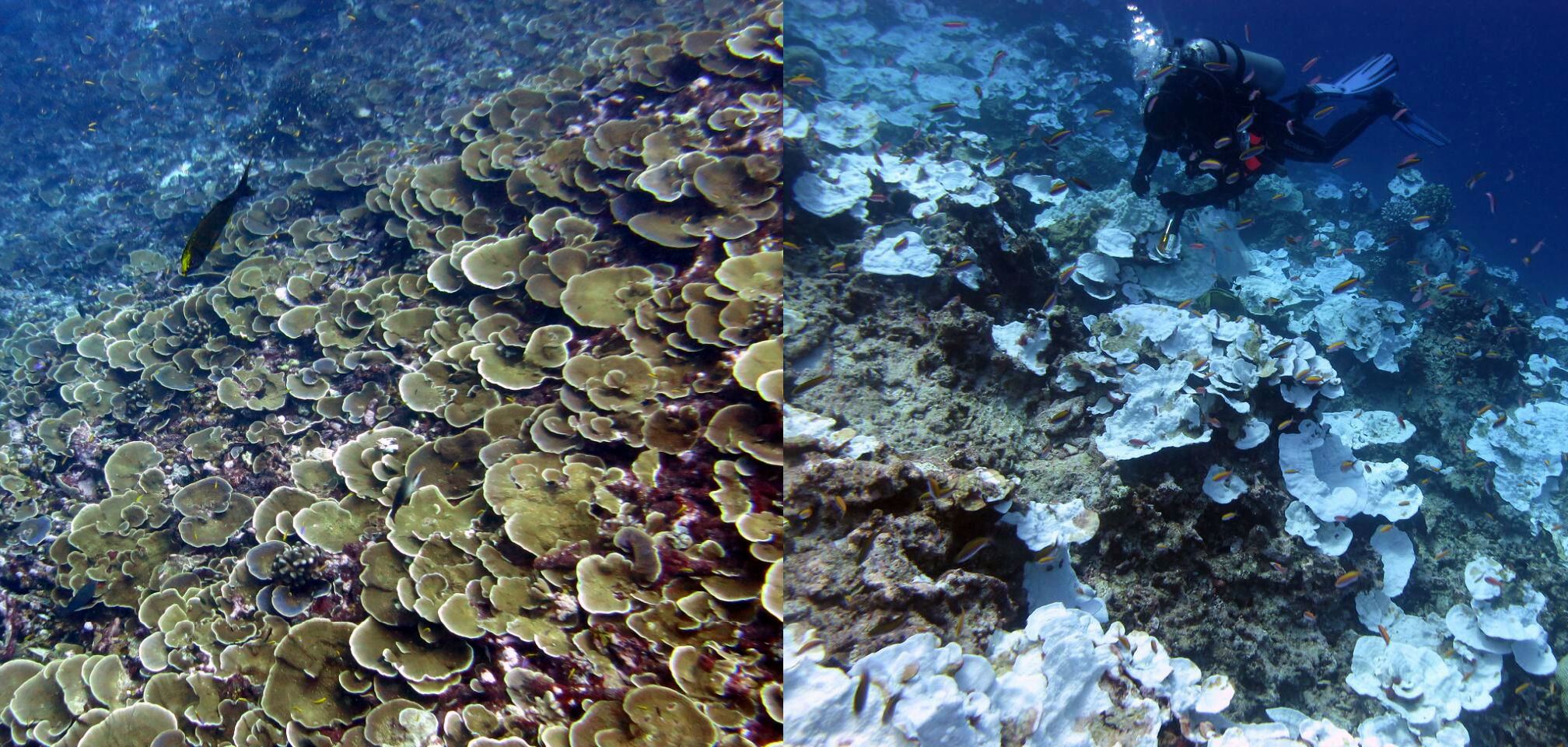 Jarvis Island healthy coral from April 2015 & bleached coral from November 2015 (Image credit: NOAA)