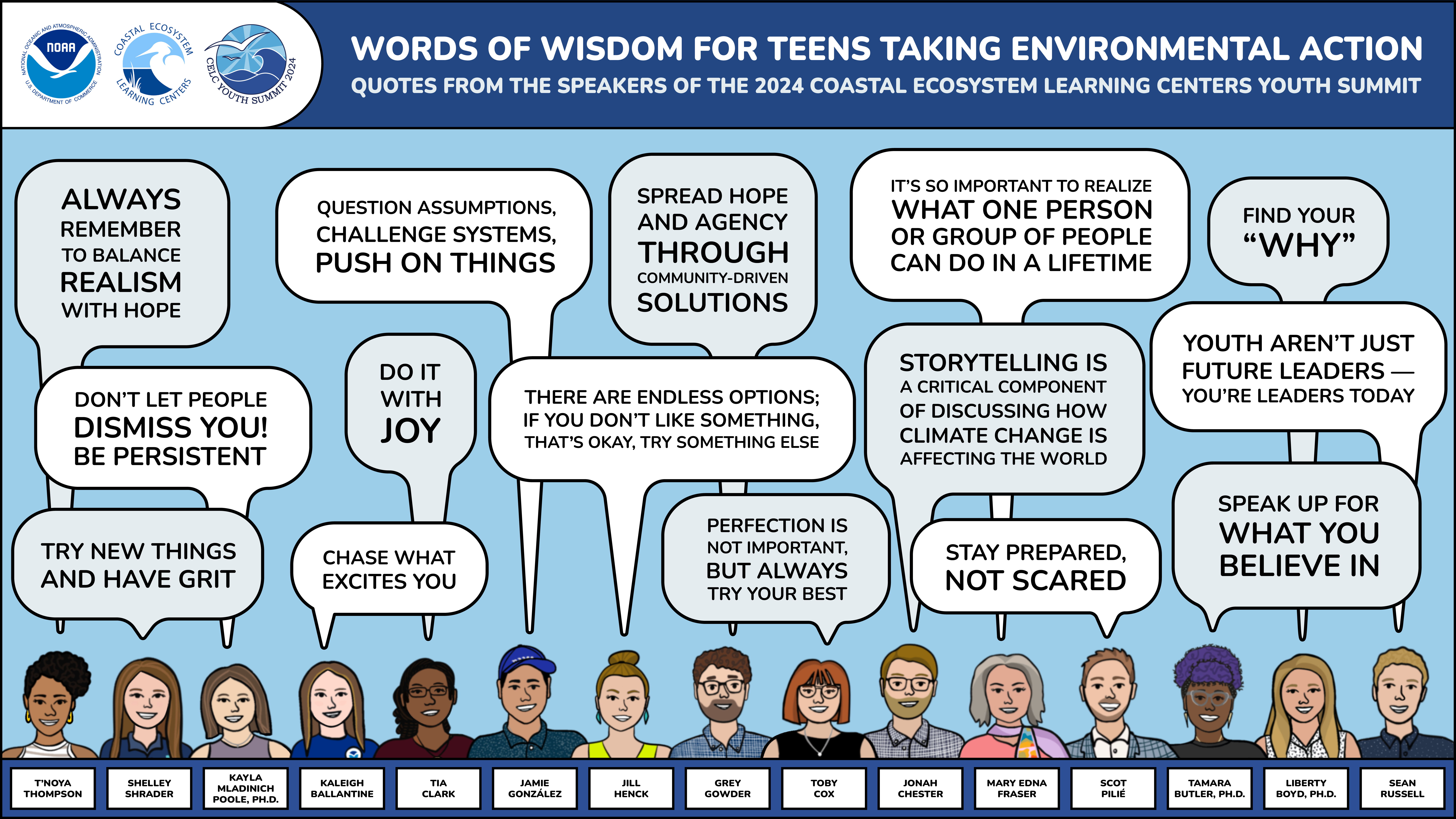 From experts on meteorology to climate journalism to marine biology and beyond, each speaker was personally invited by members of the summit’s Youth Planning Team and brought unique insight to share. Explore the infographic and individual quotes below for some inspiration and advice for those looking to take on their own project!