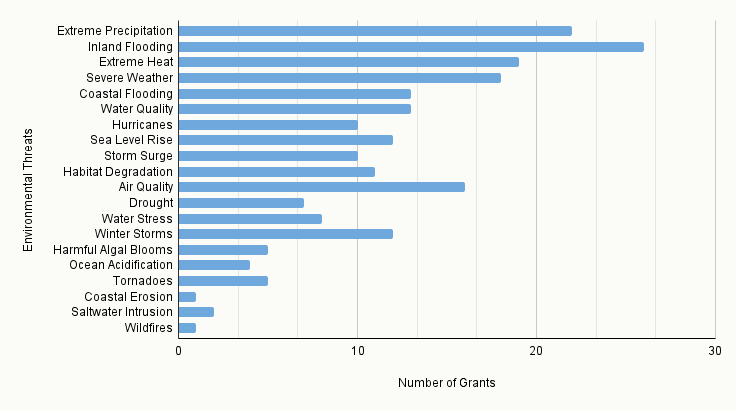 The bar chart below illustrates the environmental threats addressed by resilience education recipients in fiscal year 2024. A majority of the recipients responded to several threats concurrently. The most commonly addressed threats included extreme heat events, extreme precipitation, and flooding.