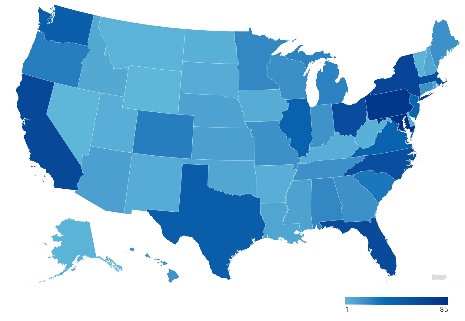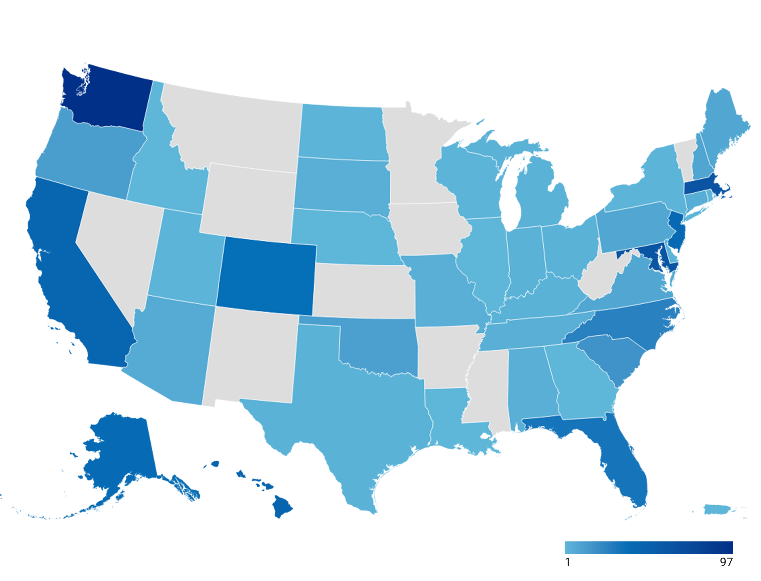 The Hollings program supports students who will be our nation’s future STEM researchers, social scientists, educators, and more. Scholars have hailed from across the United States (Figure 4) and represented more than 450 institutions (Figure 5) and a broad range of academic disciplines (Figure 6), including majors such as environmental science, sustainability studies, computer science, aerospace engineering, biochemistry, sociology, mathematics and statistics, economics, and science education, to name a few.