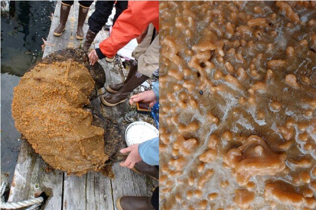 Another type of invasive species monitoring we do in affiliation with the Smithsonian Environmental Research Center offsite link is focused on invasive tunicates. The invasive tunicates are a type of marine invertebrate that builds up on surfaces and can destroy fishing or mariculture equipment and smother native species. We have PVC plates in harbors across the bay and every quarter we swap the plates and collect the “biological fouling” that collected on the plates. Biological fouling refers to all of the marine plants, animals, microbes, and more that have grown on the plate. It’s very fun to learn about what kinds of invertebrates grow on the plates (bryozoans, sponges, and tunicates galore!), and can get very messy too!