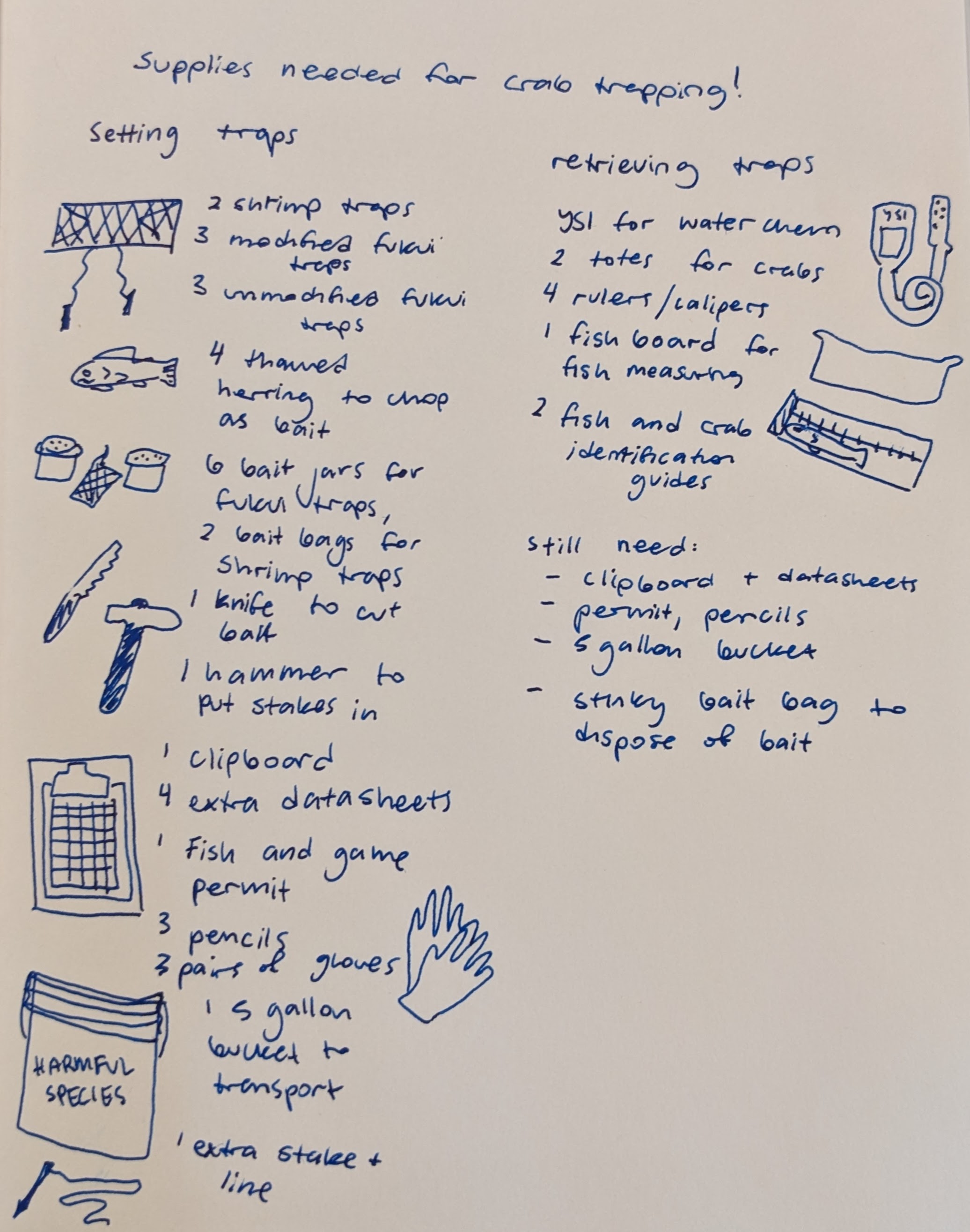 Wake up, make breakfast, pack lunch and prepare supplies to bring to the boat. Depending on if we are setting the traps or retrieving them, we have different lists of things we need to bring.