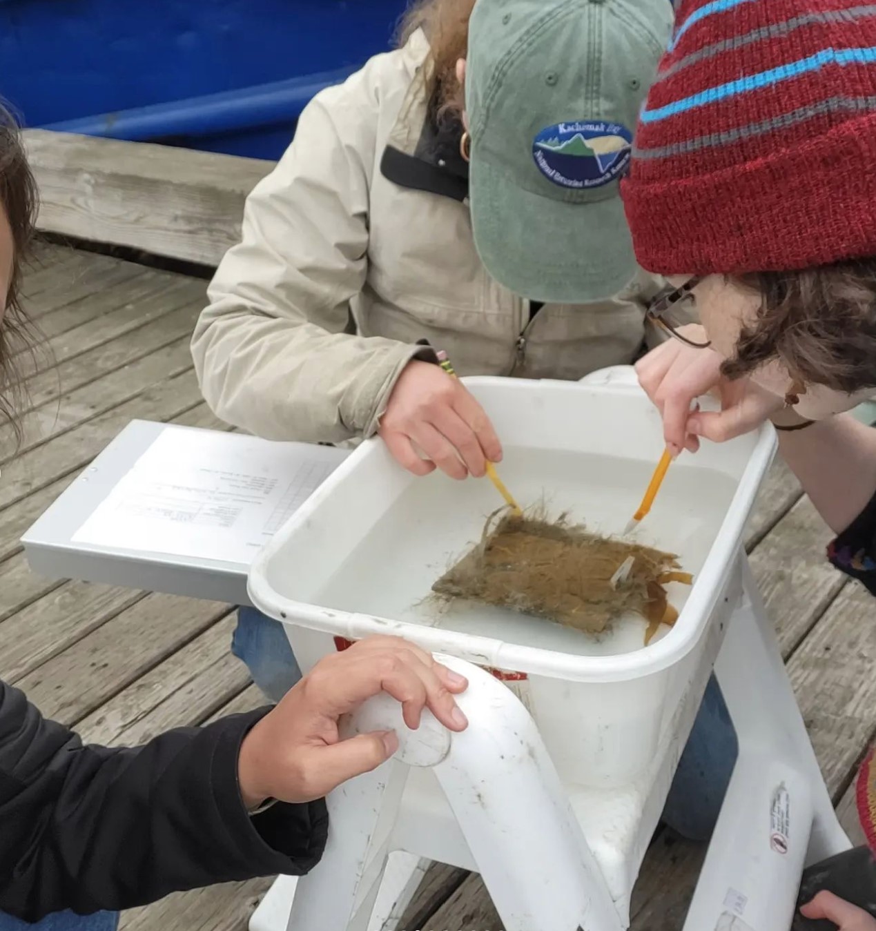 Nicole Reynolds (right) and colleagues examining a tunicate plate for invasive tunicates during her 2023 Hollings internship with the Kachemak Bay National Estuarine Research Reserve in Alaska. (Image credit: McKenna Shook)