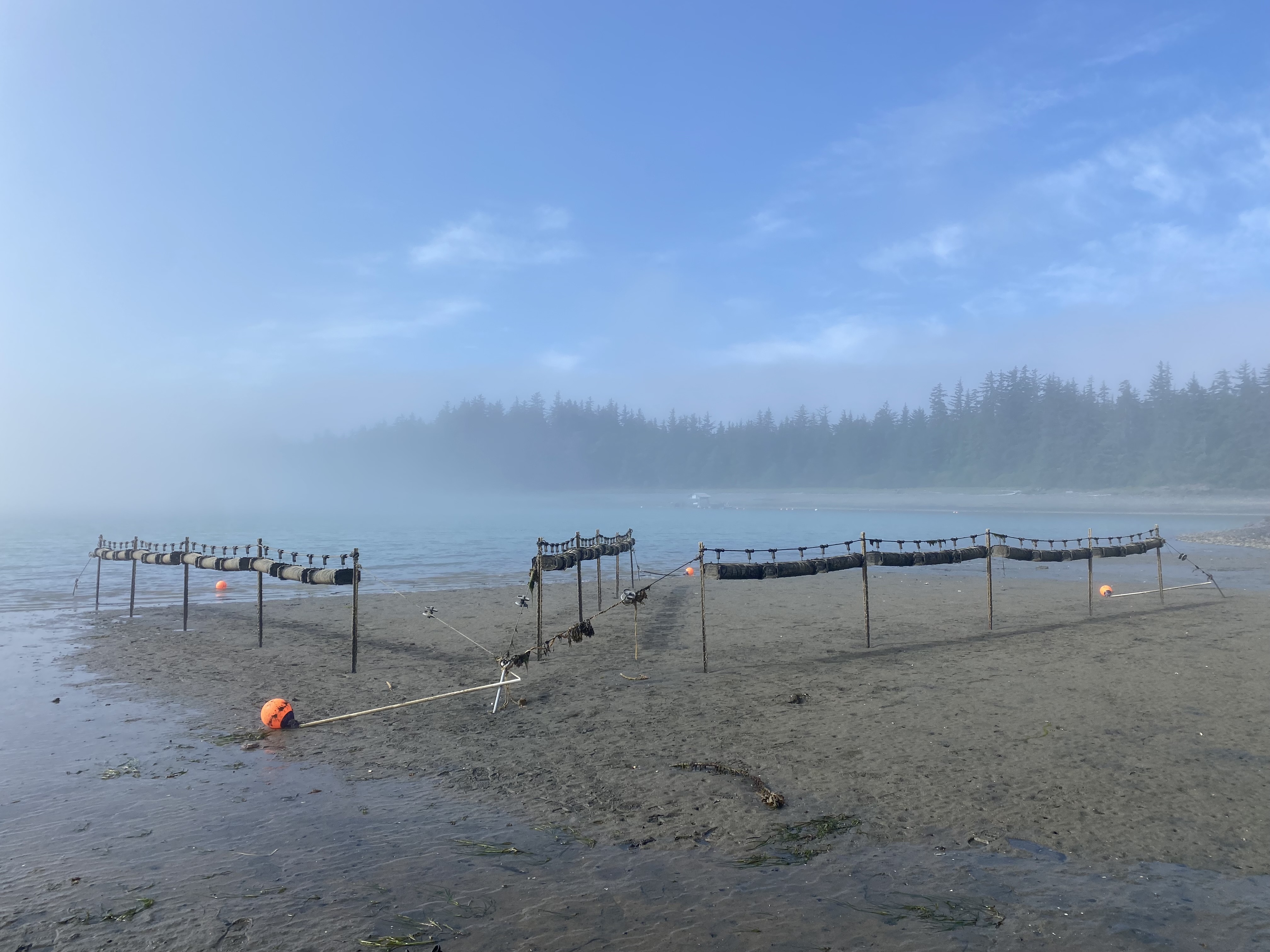 An intertidal array with three pivot lines of twelve tumble cages at Salty Lady Seafood Company in Alaska. These cages were exposed to air during low tide and were fully submerged during high tide. (Image credit: Liz Roros)