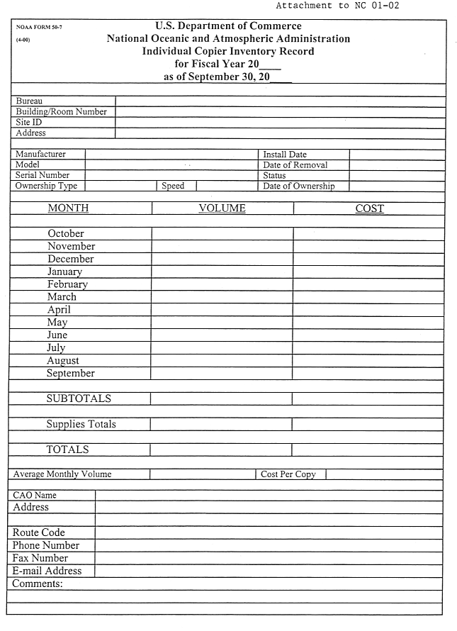 a completed NOAA FORM 50-7, Individual Copier Inventory Record (see attachment), covering the prior fiscal year; and