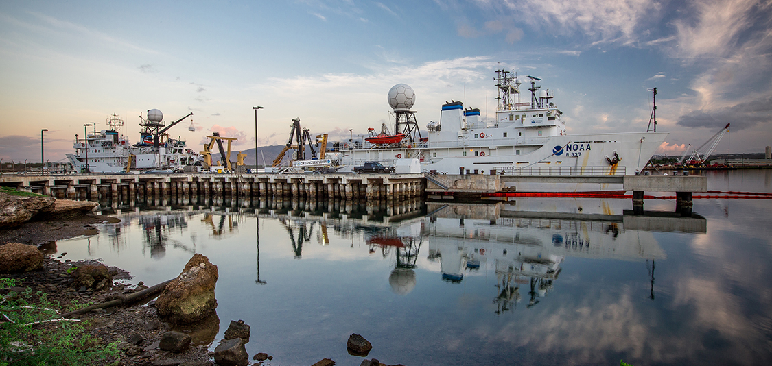 NOAA Ship Okeanos Explorer (right) in port on Ford Island, Pearl Harbor, Hawaii, before the first remotely operated vehicle expedition of CAPSTONE in July 2015. (Image credit: NOAA)