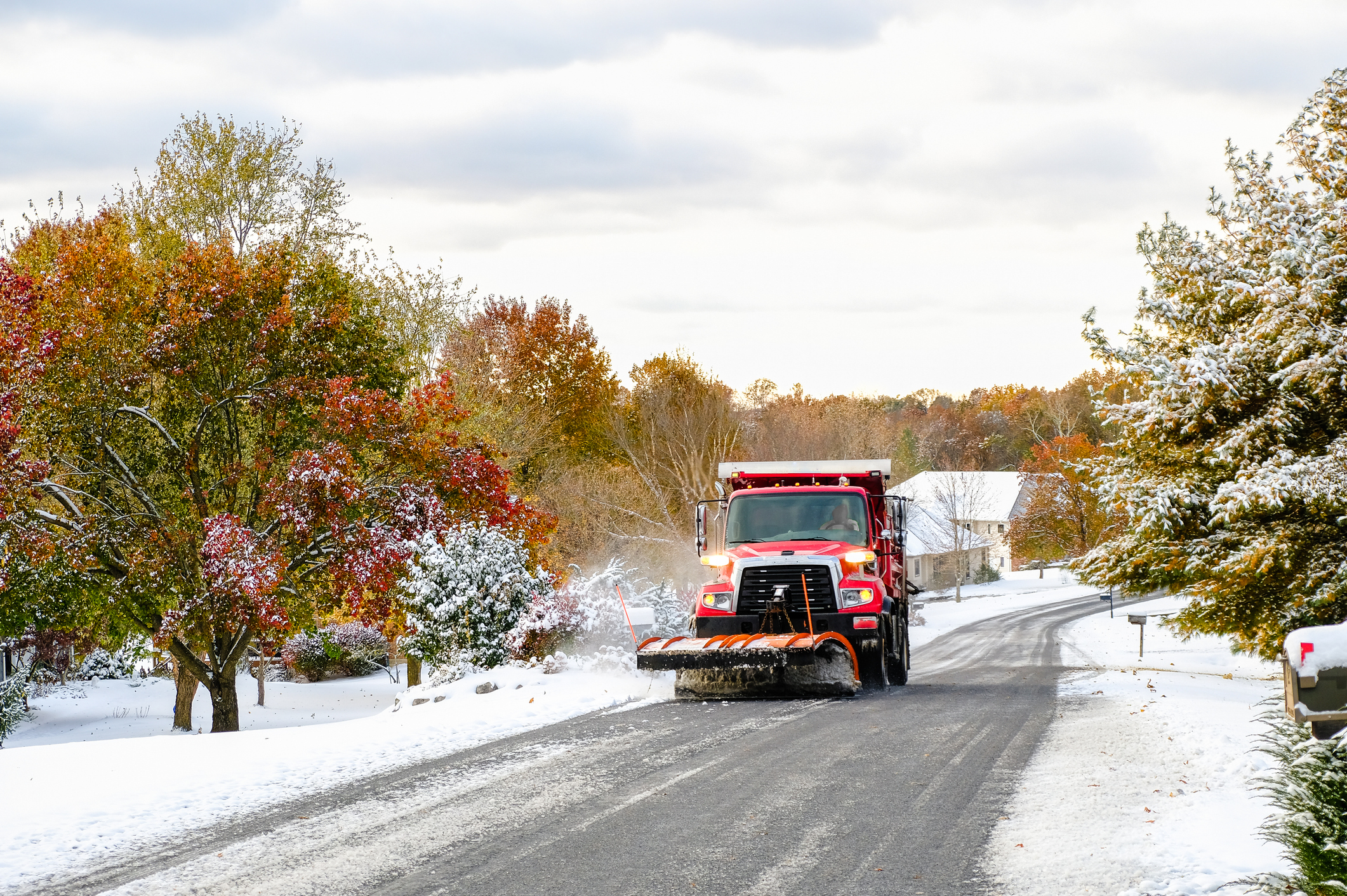 A first autumn snowfall: A snowplow-fitted truck heads down a local road in Missouri. Undated stock image. (Image credit: istock )