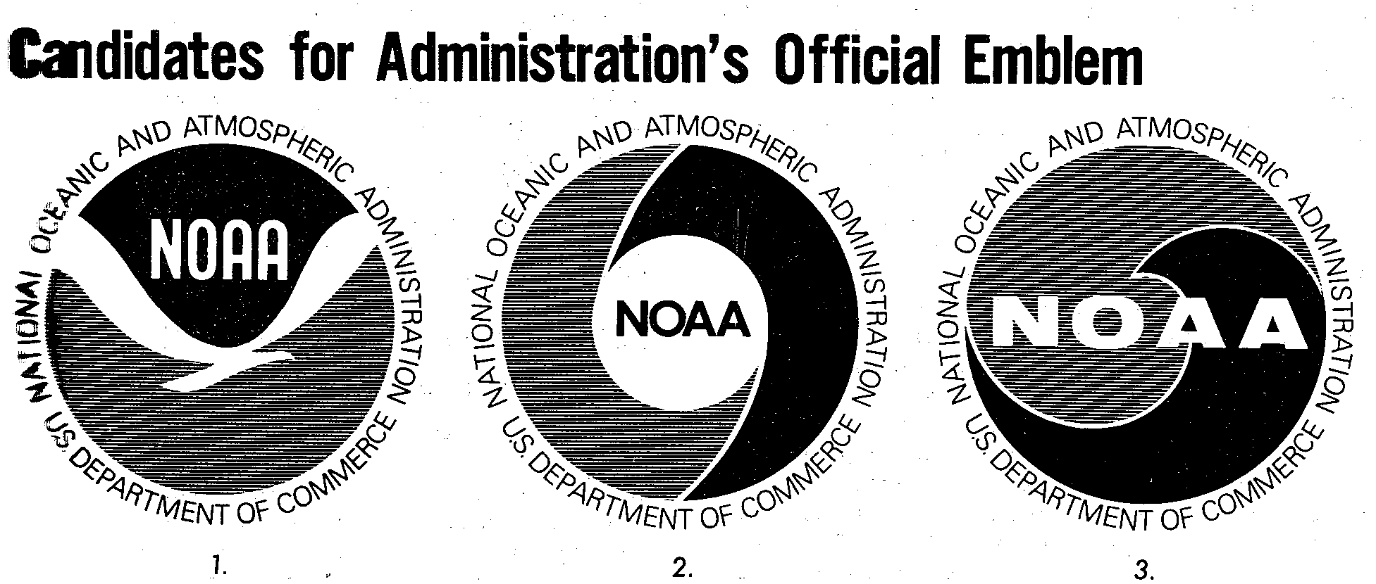 As is the case with any new agency, NOAA leaders needed to build a brand, and our emblem as we now know it had some competition. By January 1971, they narrowed in on emblem designs and announced the top 3 to NOAA employees through NOAA Week. Here are the choices Dr. White asked employees to vote on: