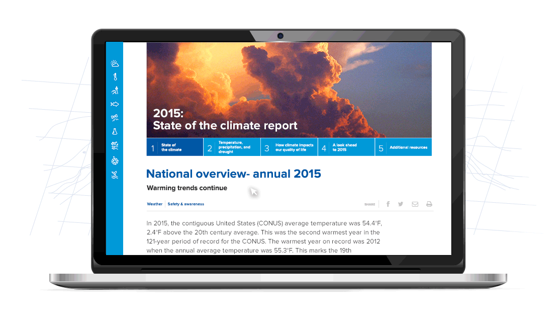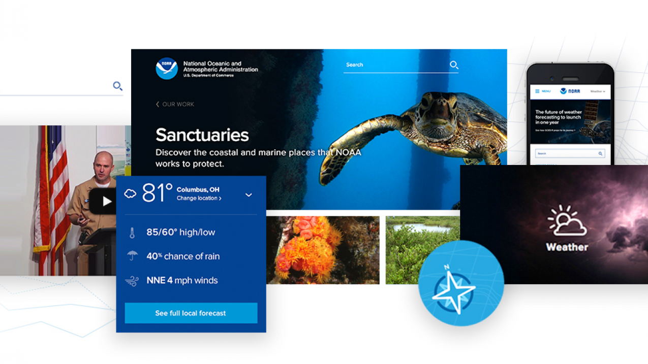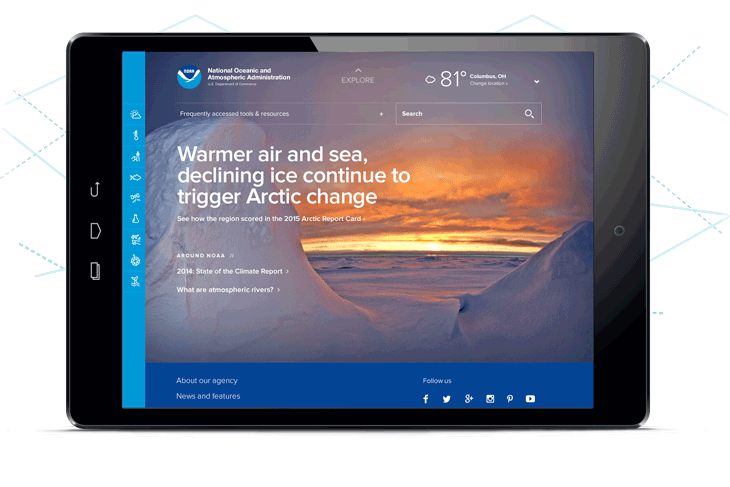Based on your feedback, we re-engineered the site with the theme of "At Your Service." We've made big changes to help you more quickly and easily find the NOAA news, data and information you've come to expect. We've also made it easier to explore the breadth of NOAA's 9 focus areas. This is just the first phase of a long-term effort to unify NOAA's web properties with a more modern look and functionality.