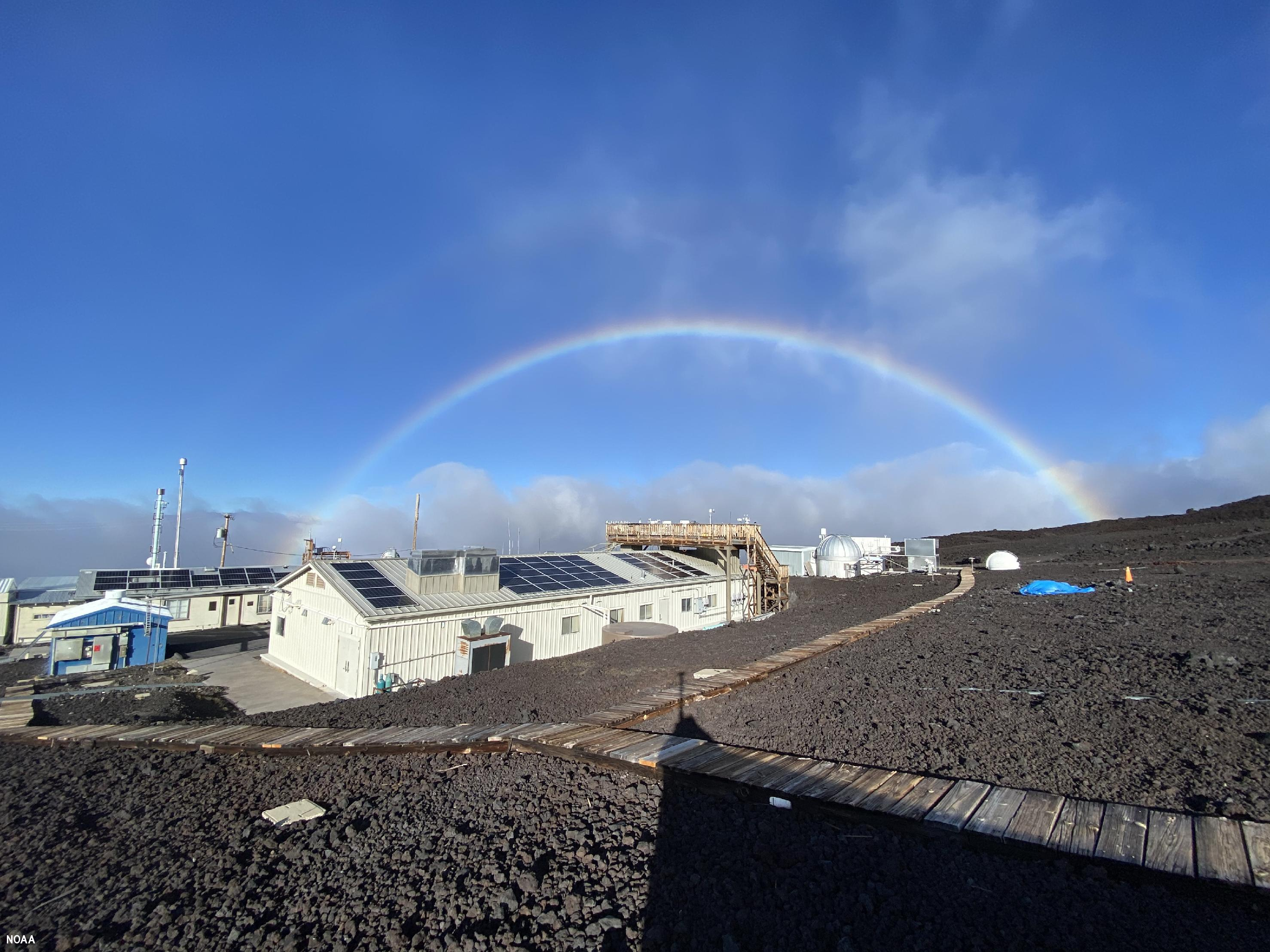 Rainbow over NOAA's Mauna Loa Observatory on the Big Island of Hawaii. The observatory is a premier atmospheric research facility that has been continuously monitoring and collecting data related to atmospheric change since the 1950s. (Image credit: Brian Vasel/NOAA)