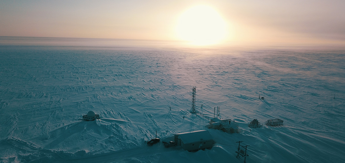 For the past two years, NOAA’s station technician Ross Burgener has been using a drone to gain photographic perspective above the flat headland jutting out into the Arctic Ocean less than two miles away. On a recent clear morning, he captured this sunrise bathing the still-frozen landscape around the observatory in a gentle wash of rose light that faded to slate blue in the lee of snow drifts.