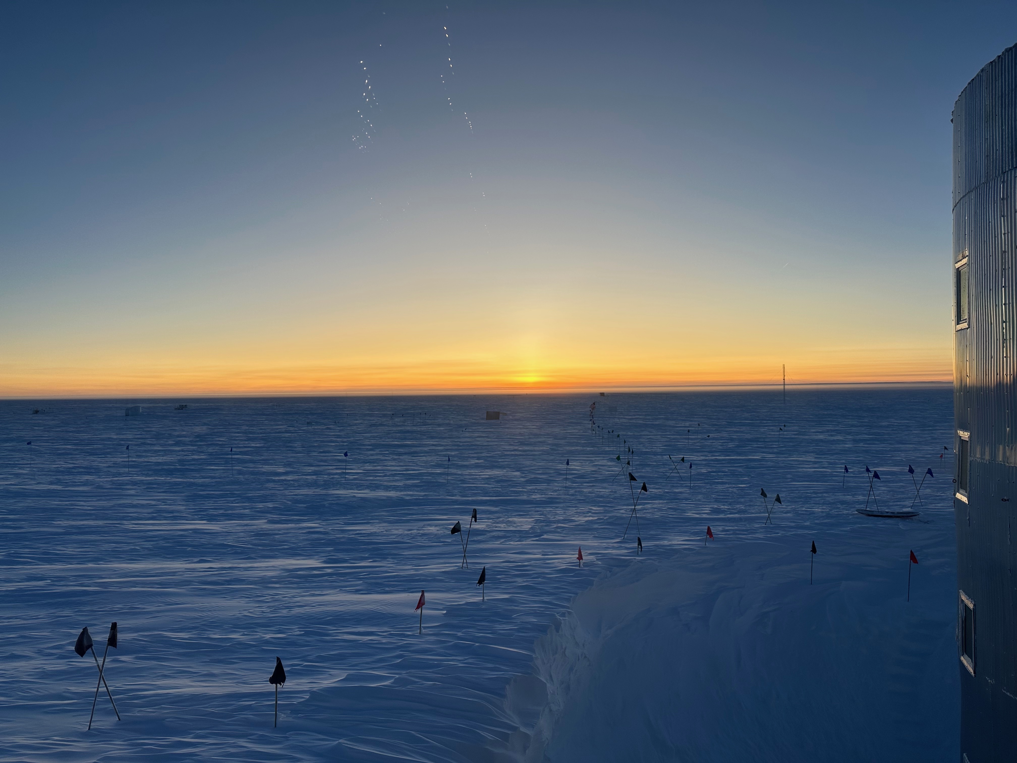 Sunrise behind the Amundsen-Scott South Pole Station. This sunrise on September 20, 2024 marked the start of spring in the Southern Hemisphere after six months of darkness for staff at NOAA's South Pole Observatory. (Image credit: Krystian Kopka/NOAA)