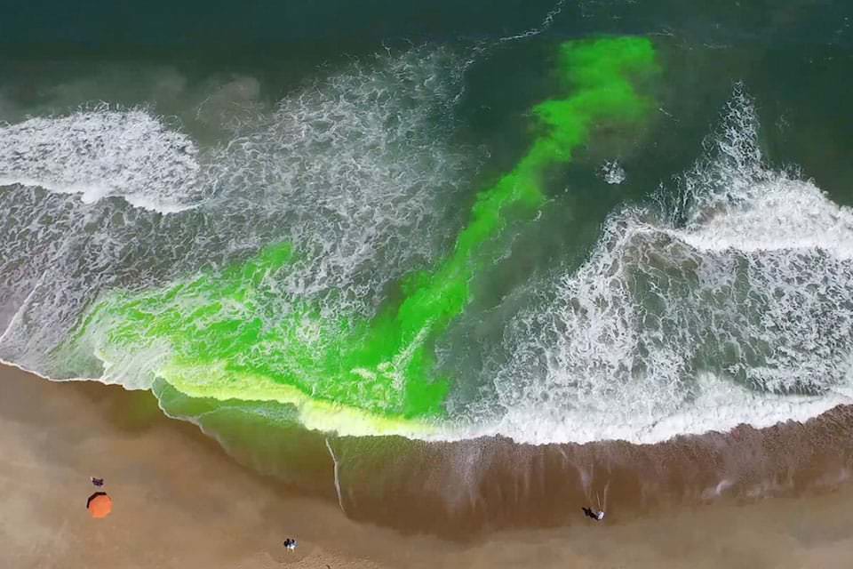 This image shows a rip current using a harmless green dye. Rip currents are powerful, narrow channels of fast-moving water that are prevalent along the East, Gulf, and West coasts of the U.S., as well as along the shores of the Great Lakes. Moving at speeds of up to eight feet per second, rip currents can move faster than an Olympic swimmer. Remember: If caught in a rip current, swim parallel to the beach to escape the current. (Image credit: NOAA National Ocean Service)
