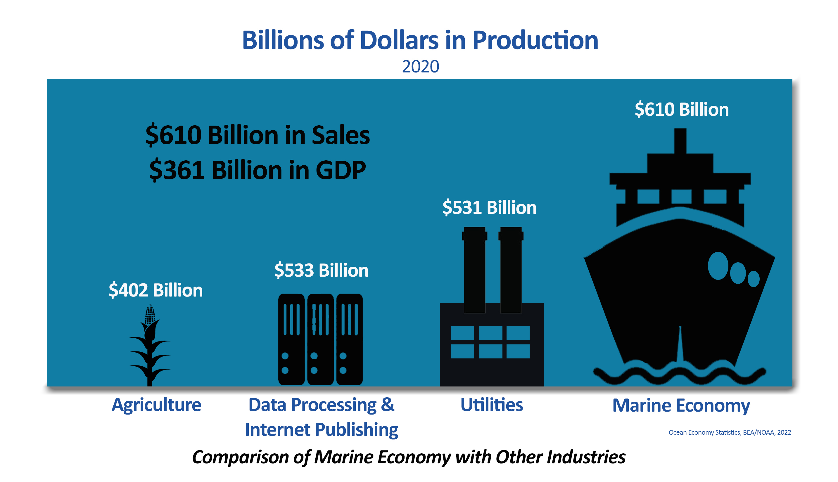 In 2020, the U.S. marine economy contributed $361 billion to GDP, generated $610 billion in sales, and supported 2.2 million jobs. By 2030, global marine economy growth is projected to reach $3 trillion.