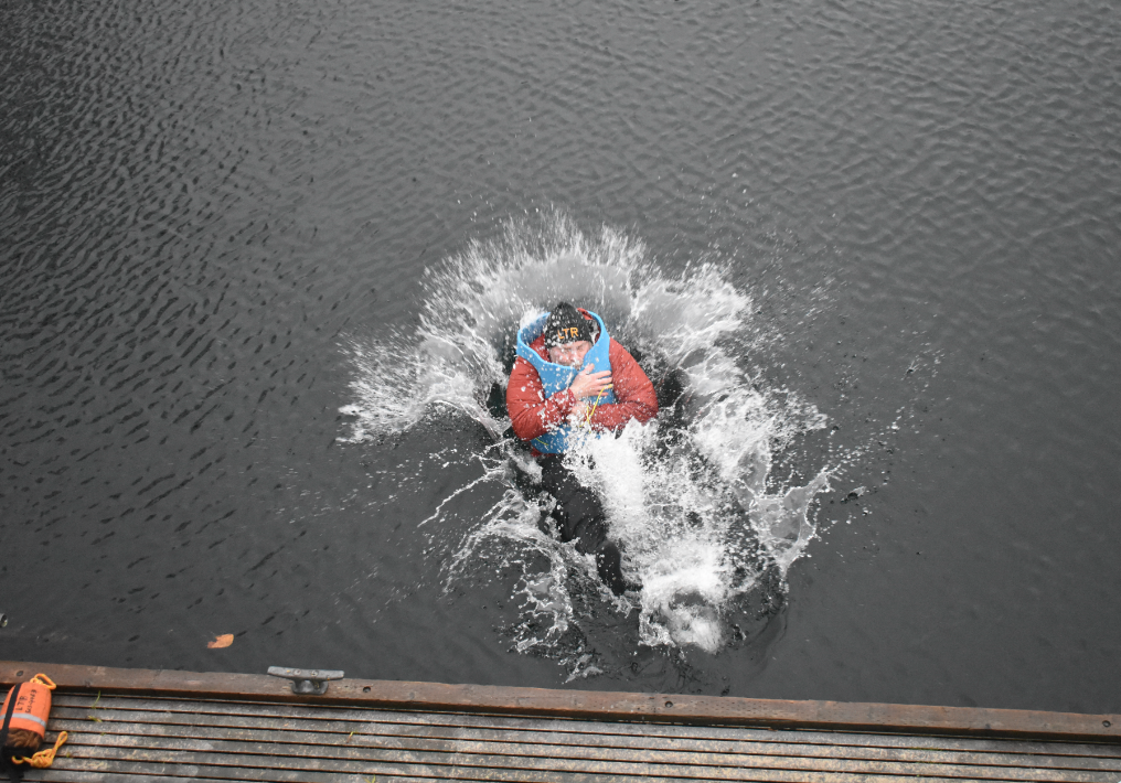 A NOAA scientist practices Arctic survival skills in cold waters of Seattle's Lake Washington, December 2019. Exercises like these teach trainees to focus on survival and the future. Trainees practiced cold-water survival swimming techniques and how to get onto a life raft. (Image credit: NOAA)