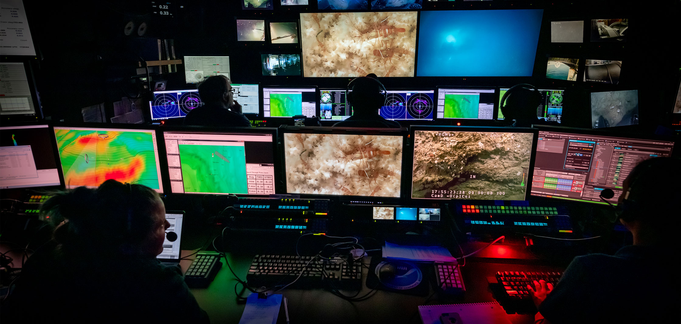 A view inside the control room on board NOAA Ship Okeanos Explorer during a remotely operated vehicle dive on the Windows to the Deep 2019: Exploration of the Southeast U.S. Continental Margin expedition. (Image credit: NOAA Office of Ocean Exploration and Research)